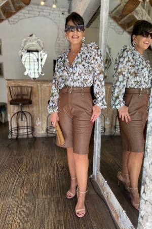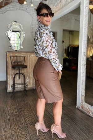 Bermuda confeccionada em PU, bolsos laterais, fechamento dianteiro por zíper e botão e cós com passantes. Acompanha cinto do mesmo material.