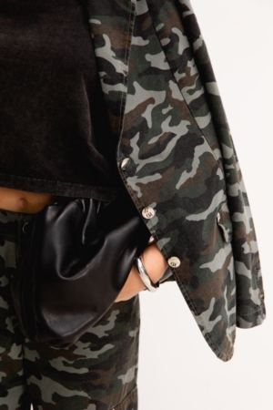 Blazer confeccionado em sarja, bolsos dianteiros com detalhe em spike, fechamento dianteiro por botões e estampa camuflada.
