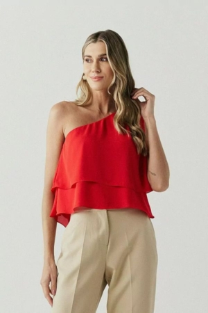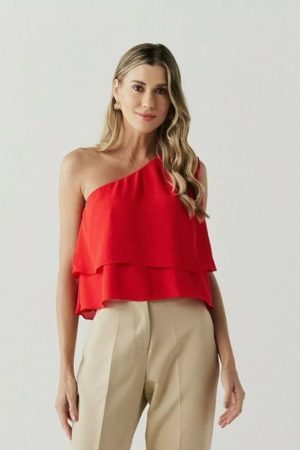 Blusa confeccionada em crepe fluido, modelo em camadas, decote de um ombro e aplicação de elástico. Possui forro.