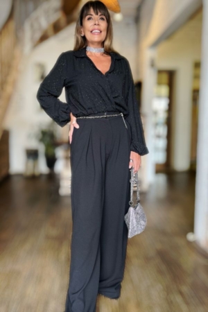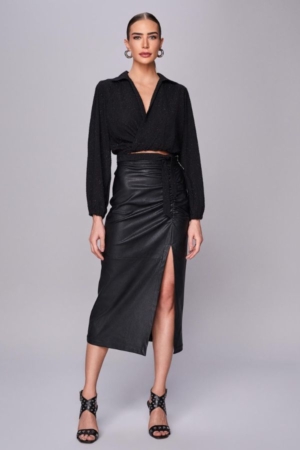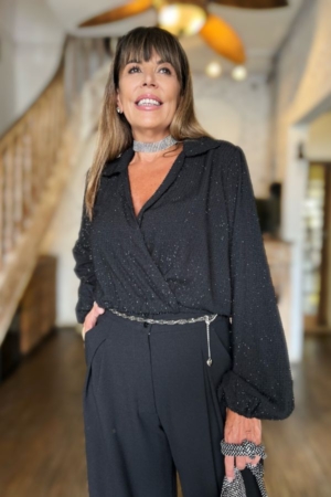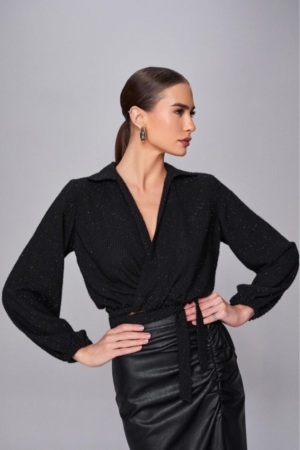 Blusa transpassada, confeccionada em tecido texturizado, com fios de lurex, amarração na barra e mangas longas com aplicação de elástico no cós.