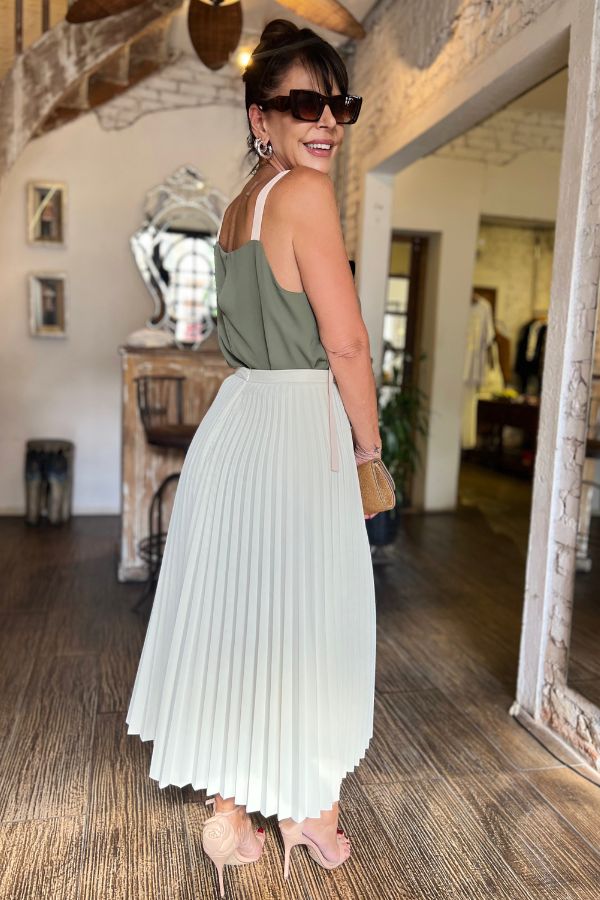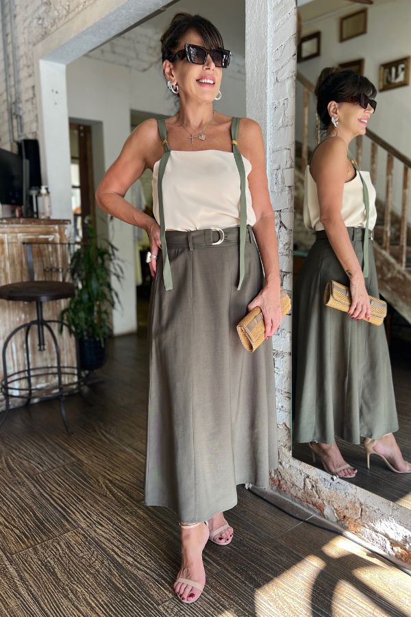Blusa confeccionada em crepe, alças grossas com detalhe metalico, faixa sobressalente e recorte em gota com fechamento por botão no decote traseiro.