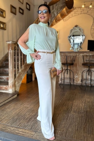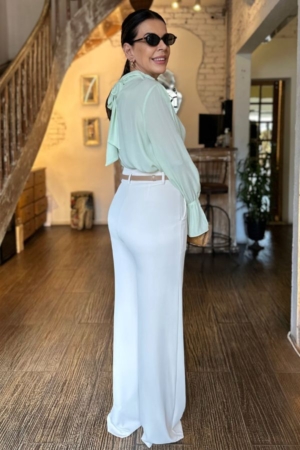 Blusa confeccionada em crepe fluído, gola alta com detalhe franzido, laço no decote traseiro e mangas longas com aplicação de elástico.