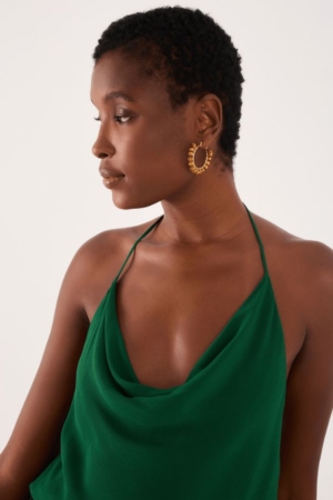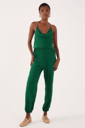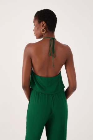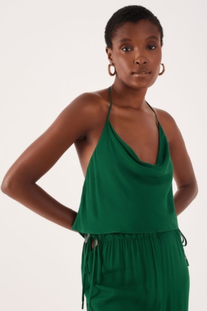 Blusa confeccionada em crepe de viscose, modelo frente única, comprimento cropped e amarração no pescoço.