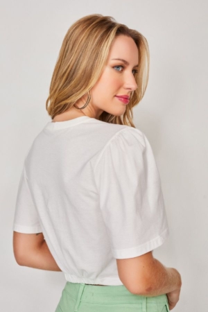 Blusa Confeccionada Em Malha De Algodão, Aplicação De Elástico Na Barra, Manga Bufante E Aplicação De Pedrarias.
