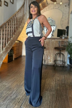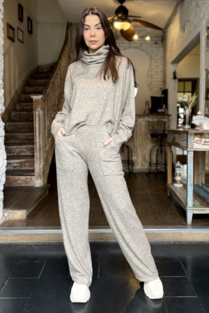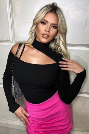 Blusa Confeccionada Em Malha Canelada, Gola Alta, Com Recorte Vazado No Decote E Mangas Longas.