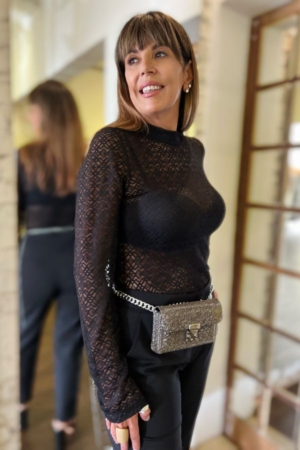 Blusa confeccionada em renda elástica, gola alta e mangas longas.