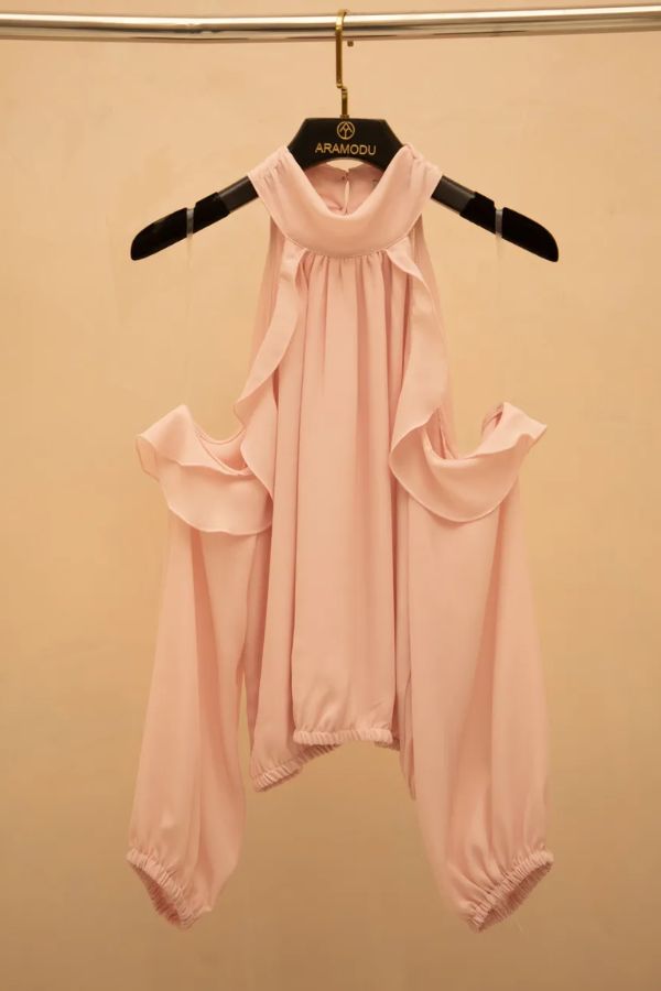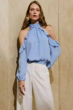 Blusa confeccionada em chiffon, decote halter neck, mangas longas com recorte nos ombros, jabor frontal e fechamento no decote traseiro por botão.