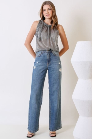 Blusa Confeccionada Em Crepe Com Fios De Lurez, Decote High Neck Com Franzido E Amarração.