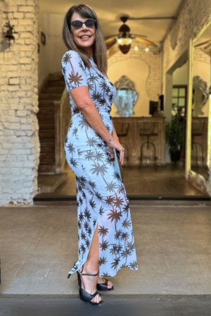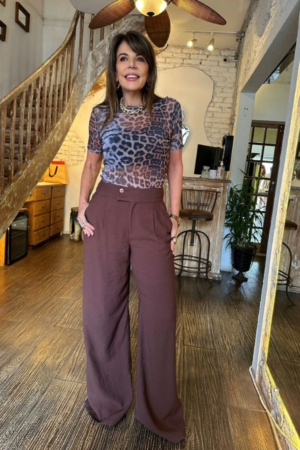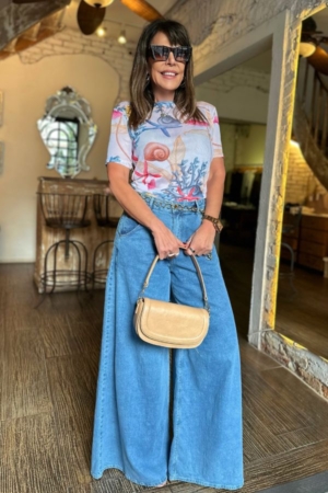 Blusa confeccionada em tule, decote careca, mangas curtas e estampa exclusiva da marca.