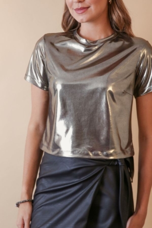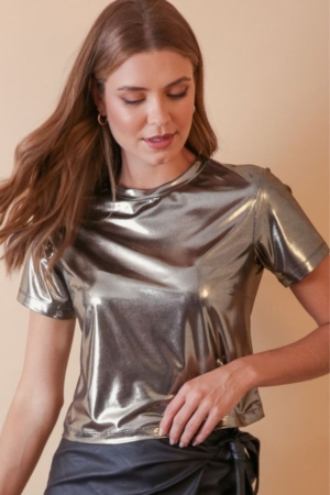 Blusa Confeccionada Em Malha Foil Metalizada, Decote Redondo E Manga Curta.