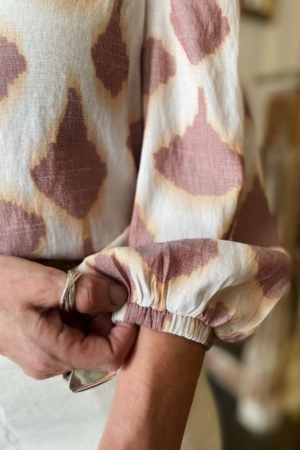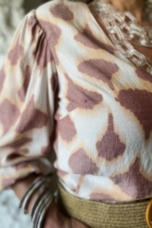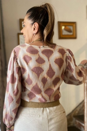 Camisa Confeccionada Em Viscose, Decote V, Mangas Longas Com Aplicação De Elástico Nos Punhos, Franzido No Ombro E Estampa Exclusiva Da Marca.