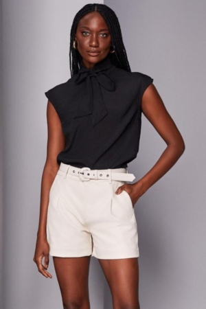 Blusa confeccionada em crepe, golinha alta com faixa para amarração e fechamento traseiro por botão.