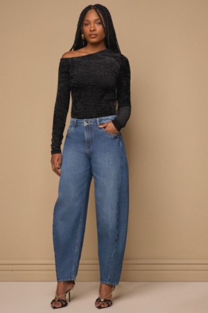 Blusa confeccionada em veludo texturizado, decote assimétrico e mangas longas.
