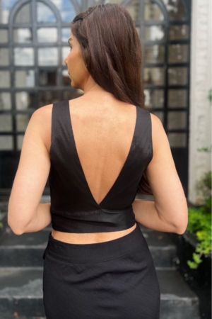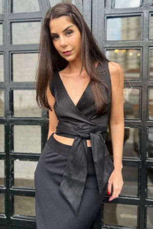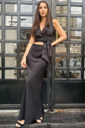 5Blusa confeccionada em tafetá, 6modelo transpassado com faixa para amarração e decote V.