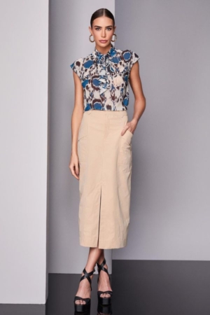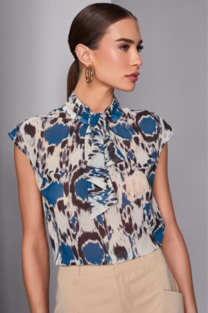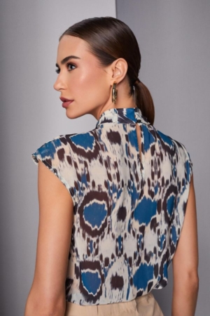 Blusa confeccionada em crepe fino, gola alta com faixa para amarração, fechamento traseiro por botões e estampa exclusiva da marca.