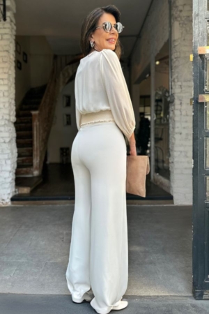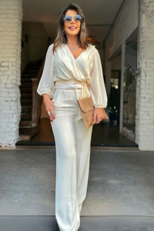 Blusa confeccionada em crepe fluido, modelo transpassado com amarração na cintura, aplicação de lastex na barra traseira e mangas longas com elástico no punho. Possui forro frontal.