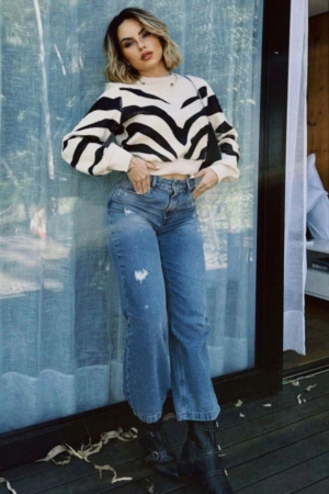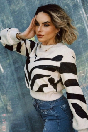 Blusa Confeccionada Em Tricot Peluciado, Com Aplicação De Ribana Na Barra E Punhos.