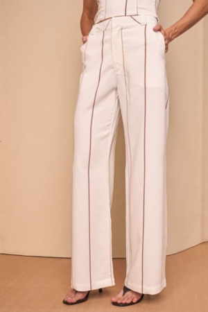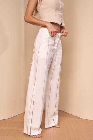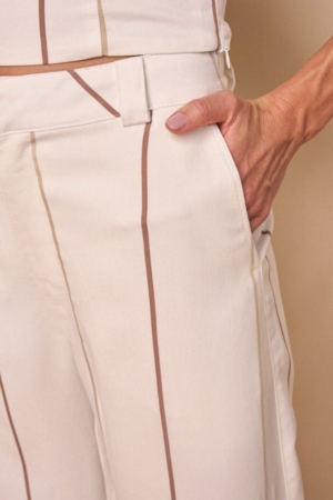 Calça confeccionada em viscose mista, modelo reto, bolsos, fechamento dianteiro por zíper e botão e estampa em listras.