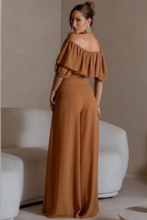 Calça confeccionada em crepe fino, modelo pantalona, vós largo e fechamento lateral por zíper.