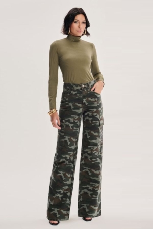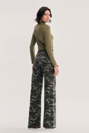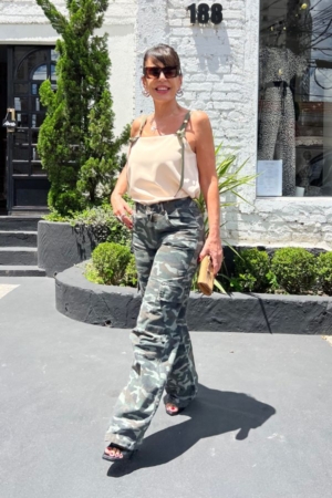 Calça confeccionada em sarja, modelo cargo com bolsos, fechamento dianteiro por zíper e botão e estampa camuflada.