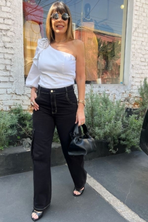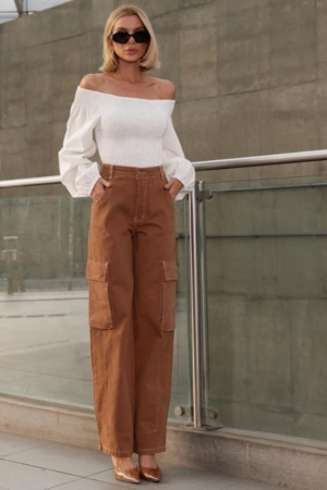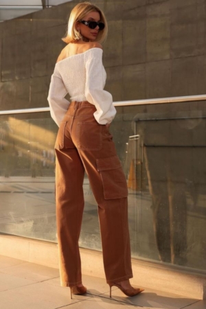 Calça confeccionaad em sarja, modelo cargo, bolsos, pespontos contrastantes e fechamento dianteiro por zíper e botão.