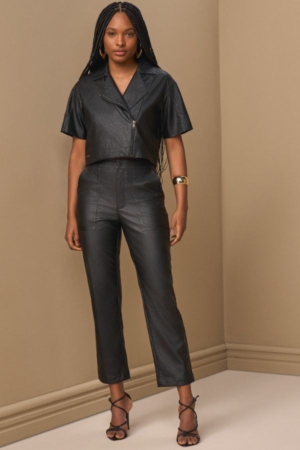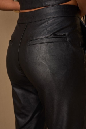 Calça confeccionada em PU, modelo slim, bolsos laterais, detalhes em pespontos e fechamento dianteiro por zíper e botão.