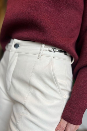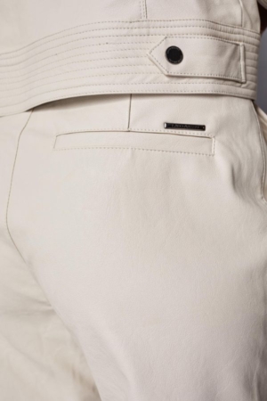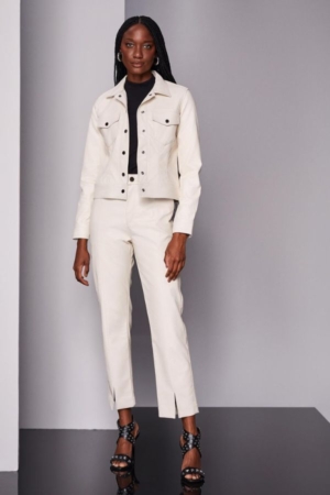 Calça confeccionada em PU, modelo reto, fenda dianteira, detalhe em friso, bolsos lateraisdetalhe metálico no cós e fechamento dianteiro por zíper e botão.