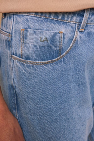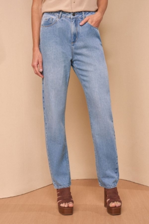 Calça jeans modelo reto, bolsos e fechamento dianteiro por zíper e botão.