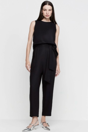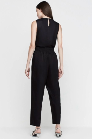 Calça confeccionada em viscose sarjada, modelo carrot, aplicação de elástico no cós traseiro e faixa fixa para ajuste na cintura.