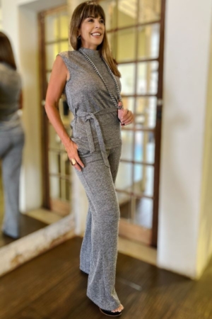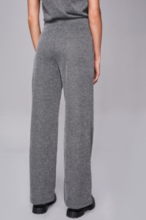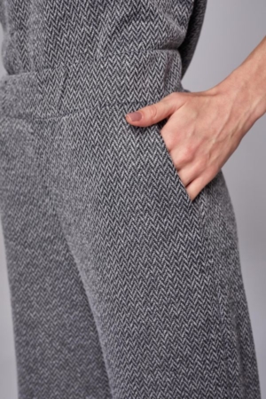 Calça confeccionada em tricot chevron, modelo reto, bolsos laterais e aplicação de elástico no cós.
