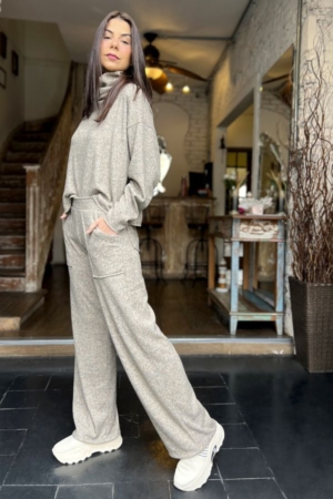 Calça Confeccionada Em Tricot Angora Com Toque Soft, Modelo Pantalona, Aplicação De Elástico Na Cintura, Bolsos Laterais E Traseiro.