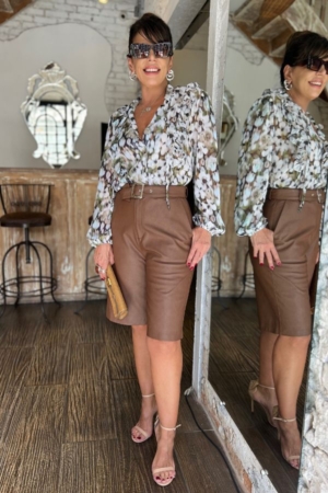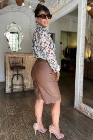 Camisa confeccionada em crepe, com babados no busto, mangas longas com aplicação de elástico no punho, faixa para laço no decote, fechamento dianteiro por botões e estampa exclusiva da marca.