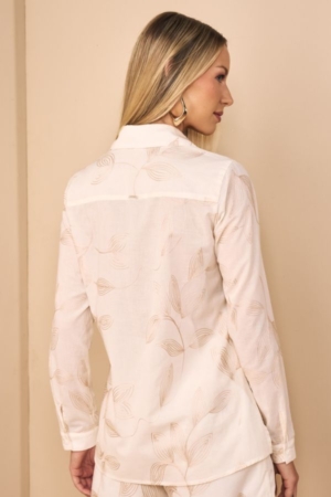 Camisa confeccionada em algodão misto, modelo alongado, vista com fechamento por botões e bordado exclusivo da marca.