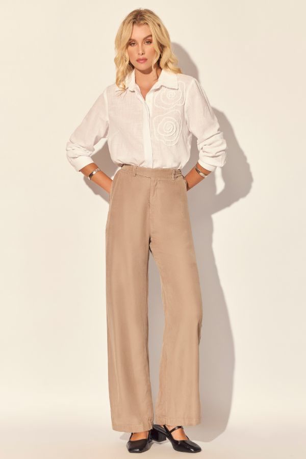 Camisa confeccionada em voil de algodão, detalhe em viés em formato de flores e fechamento dainteiro por botões.