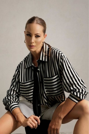 Camisa confeccionada em viscose, modelo oversize, bolsos, fechamento dianteiro por botões e estampa em listras.