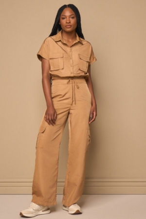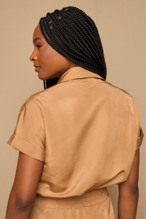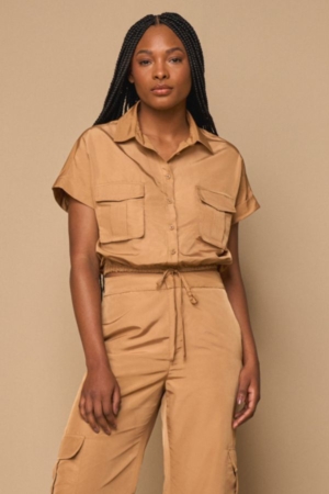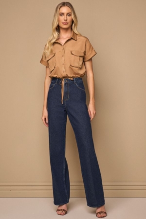 Camisa confeccionada em microfibra, modelo cropped, com cordão para ajuste na barra, bolsos dianteiros e fechamento por botões.