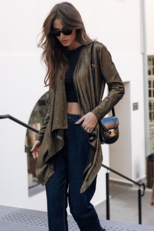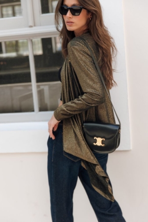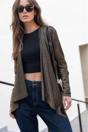 Cardigan confeccionado em malha de lurex, modelo em pontas e mangas longas.
