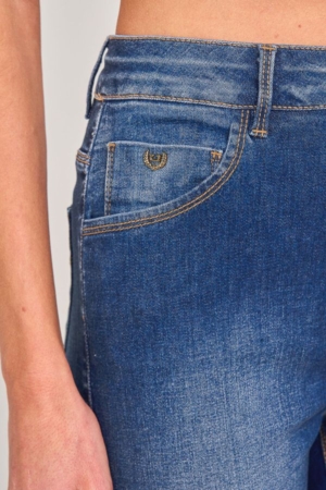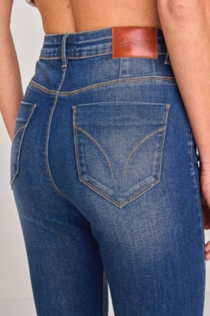 Calça jeans modelo flare, pespontos, passantes no cós, bolsos e fechamento dianteiro por zíper e botão.