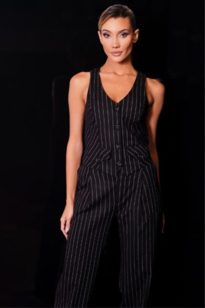 Colete em alfaiataria, fechamento dianteiro por botões e estampa risca de giz. Possui forro.