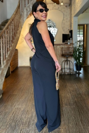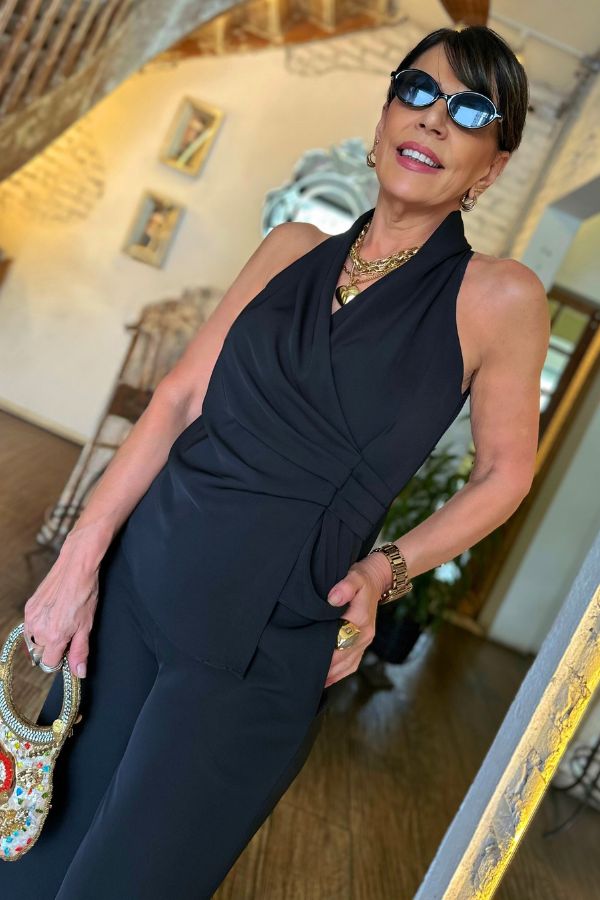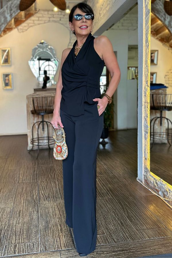 Conjunto confeccionado em crepe, blusa modelo transpassado com detalhe franzido, calça modelo reto, bolsos laterais e fechamento dianteiro por zíper e botão.