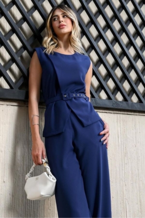 Conjunto em alfaiataria, blusa transpassada, modelo alongado, calça pantalona, bolsos laterais e fechamento dianteiro por zíper e botão. Acompanha cinto e possui forro.