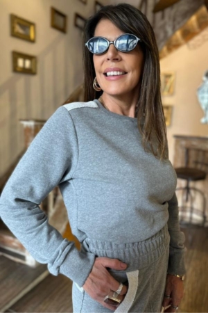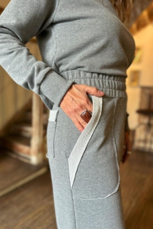 Conjunto confeccionado em moletom, blusa com decote careca, mangas longas com punho, detalhe nos ombros, calça modelo reta, aplicação de elástico na cintura, bolsos laterais e detalhe.