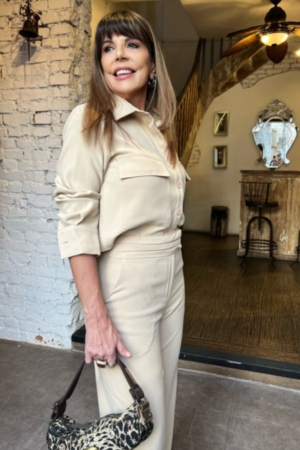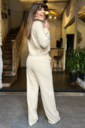 Conjunto alfaiataria confeccionado em crepe, camisa cropped com bolsos e fechamento frontal, calça com cós transpassado, bolsos laterais e fechamento dianteiro por zíper e botão.