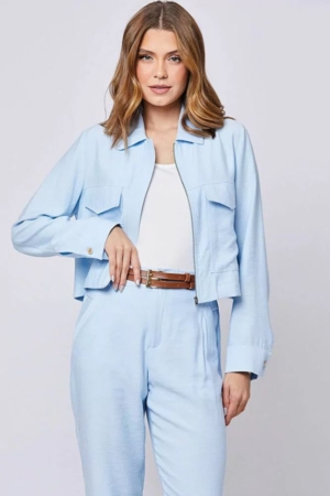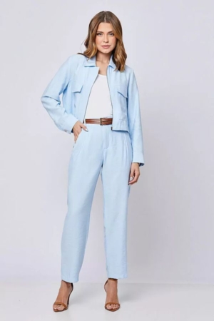 Conjunto confeccionado em viscose mista, jaqueta com fechamento frontal por zíper, bolsos cargo, calça modelo reto, detalhe no cós, bolsos laterais e fechamento dianteiro por zíper e botão. Acompanha cinto.