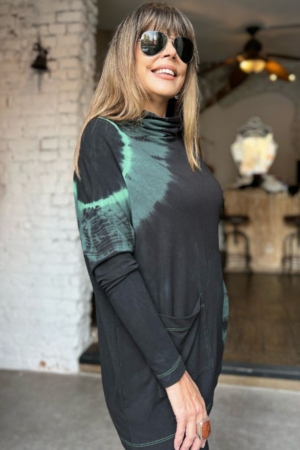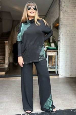 Conjunto confeccionado em malha de viscose, blusa com modelagem ampla, gola alta, calça pantalona, com bolsos laterais, aplicação de elástico no cós e estampa tie dye.