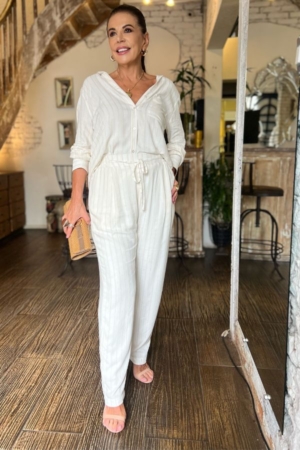 Conjunto confeccionado em viscolinho listrado, camisa com fechamento por botões, bolso frontal, calça modelo reto, aplicação de elástico no cós, tiras para amarração e bolsos laterais.