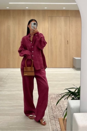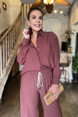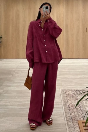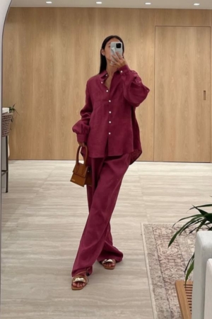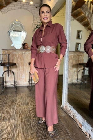 Conjunto confeccionado em viscose sarjada, camisa modelo oversize, fechamento dianteiro por botões, calça reta com aplicação de elástico na cintura e bolsos laterais.