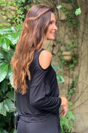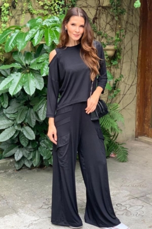 Conjunto Confeccionado Em Malha De Viscose, Blusa De Modelagem Ampla, Abertura No Ombro, Calça Modelo Pantalona, Com Bolsos E Aplicação De Elástico No Cós.