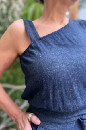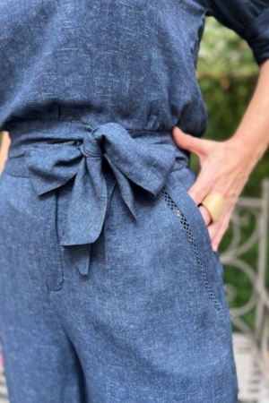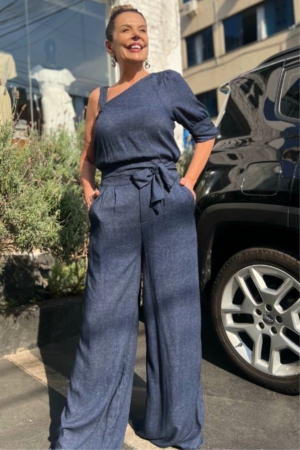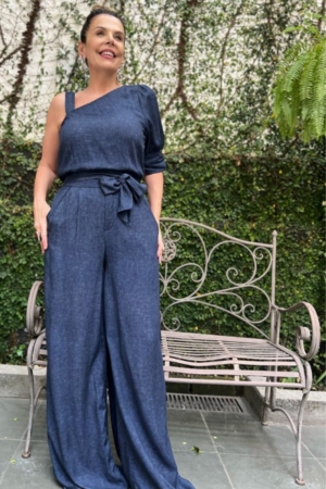 Conjunto Confeccionado Em Viscolinho, Blusa Assimétrica Com Aplicação De Entremeio Na Alça, Amarração Na Barra, Calça Modelo Pantalona, Com Aplicação De Elástico No Cós, Bolsos E Fechamento Dianteiro Por Zíper E Botão.