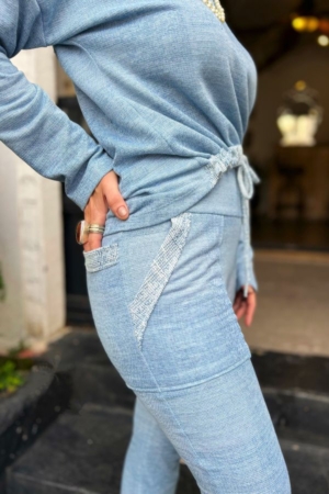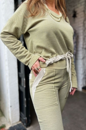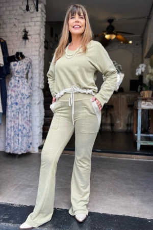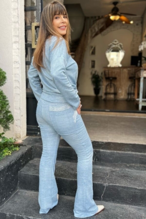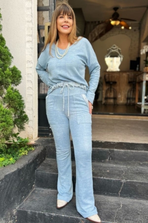 Conjunto confeccionado em tecido jacquard, blusa decote V, detalhe de amarração na barra, calça modelo flare, cós largo com aplicação de elástico, bolsos laterais e detalhes do avesso.